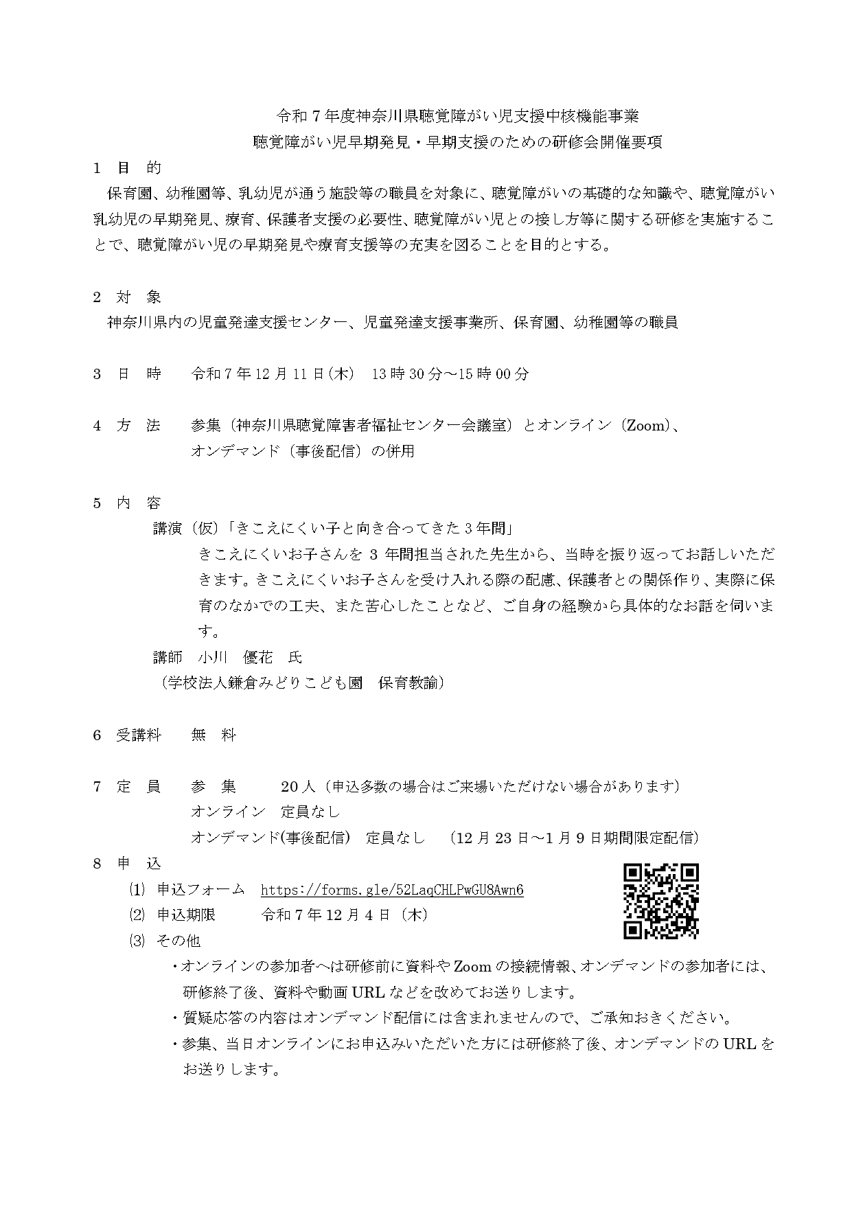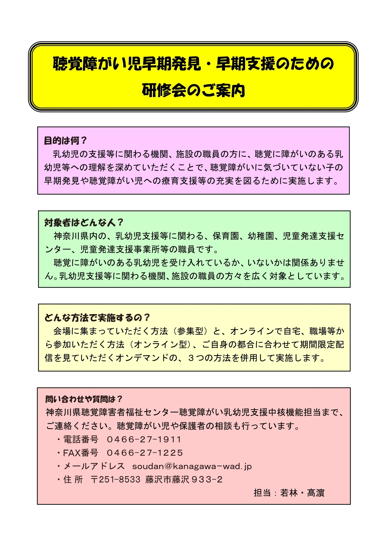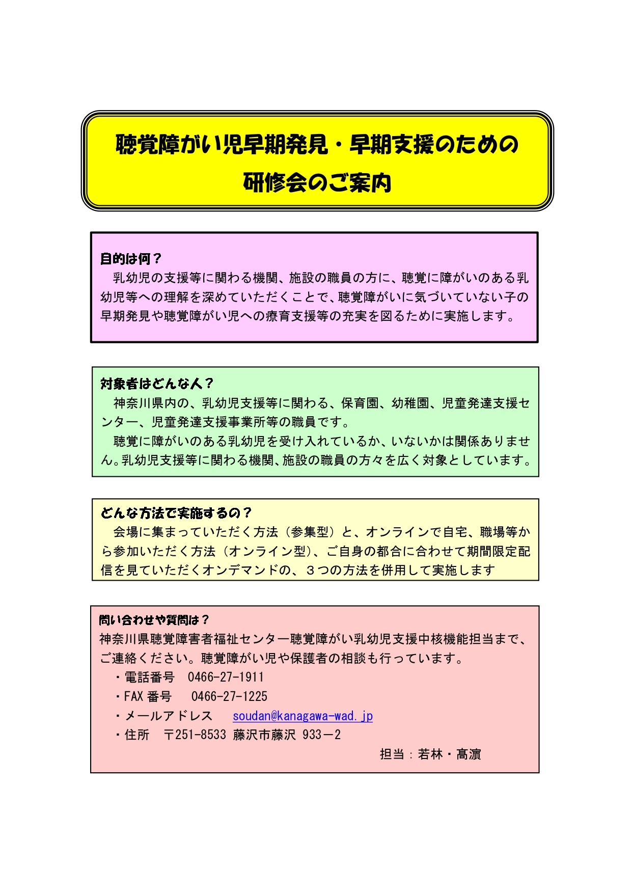| 対象 | 神奈川県内の児童発達支援センター、児童発達支援事業所、保育園、幼稚園等の職員 |